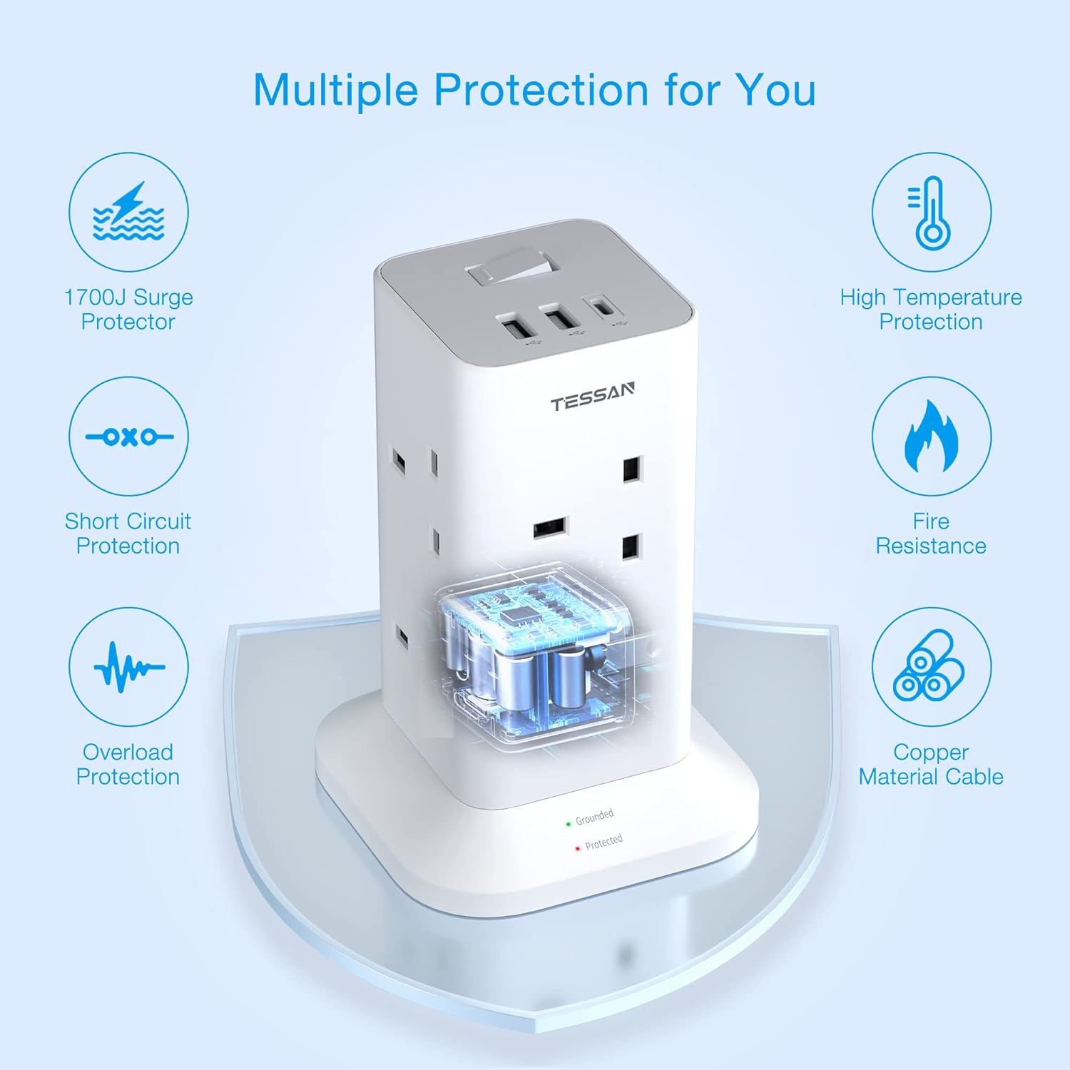 - Extension Lead Tower with USB Slots: TESSAN plug adapter tower with 8 AC outlets (3500W max), 2 USB A, and 1 15W USB C ports can power 11 devices simultaneously. It can be your charging station for multiple devices